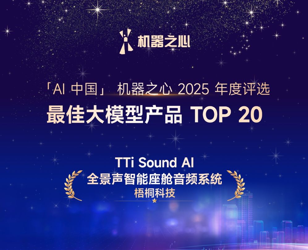 12月31日,「AI 中国」机器之心2025年度评选正式揭晓,梧桐车联科技有限公司(以下简称“TINNOVE梧桐科技”)旗下TTi Sound AI全景声智能座舱音频系统成功入选“最佳大模型产品TOP20”。该产品作为行业首发的由大模型驱动的车载音频方案,重塑座舱内听音体验,成为智能座舱领域AI大模型落地的典型代表。